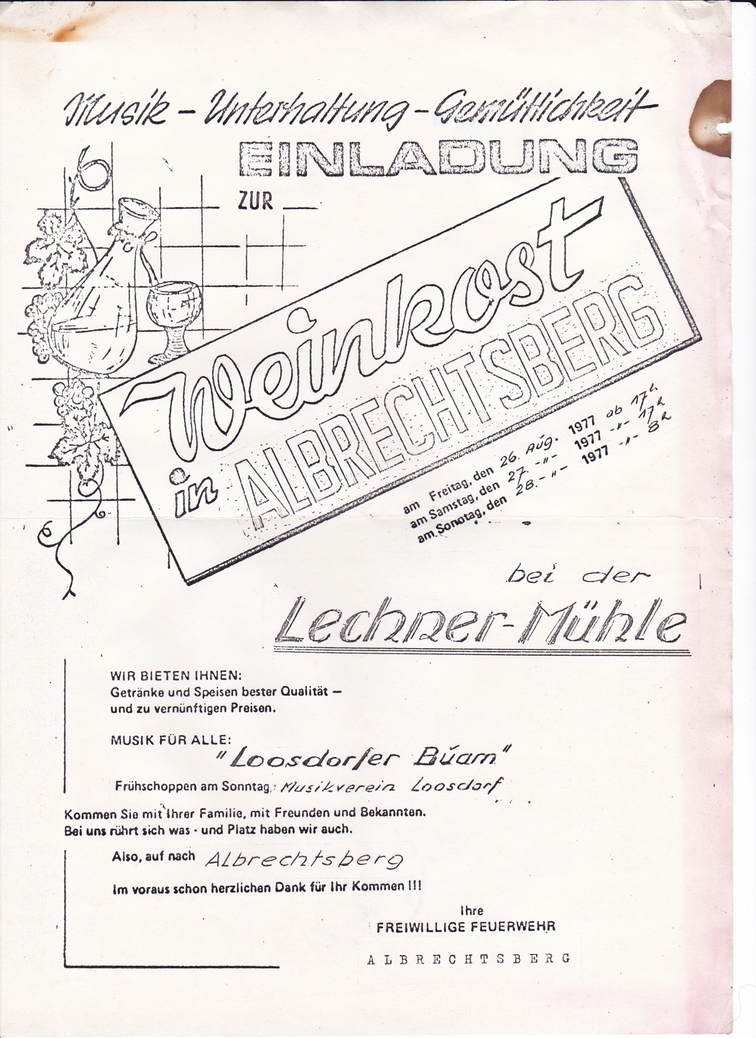 | 1974 | Erringung des Feuerwehrleistungsabzeichen in Gold für Gerhard Poschkamp1974 – 1980 Heuriger im Lechnerstadl (Lechnermühle) | |